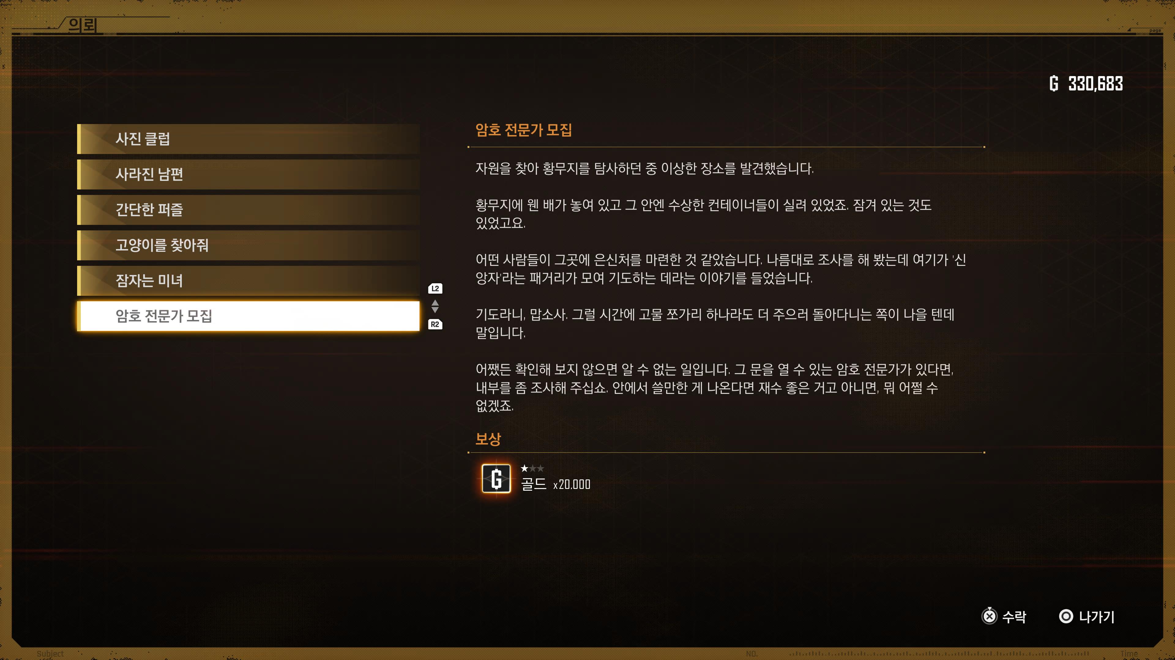 스텔라 블레이드 게시판 의뢰 중 포토 챌린지, 간단한 퍼즐, 암호 전문가 모집에 대해 작성한다. 그 외의 퀘스트들은 목적지를 다 표시해 주기에 큰 어려움 없이 진행이 가능하다. 간략한 공략 작성.