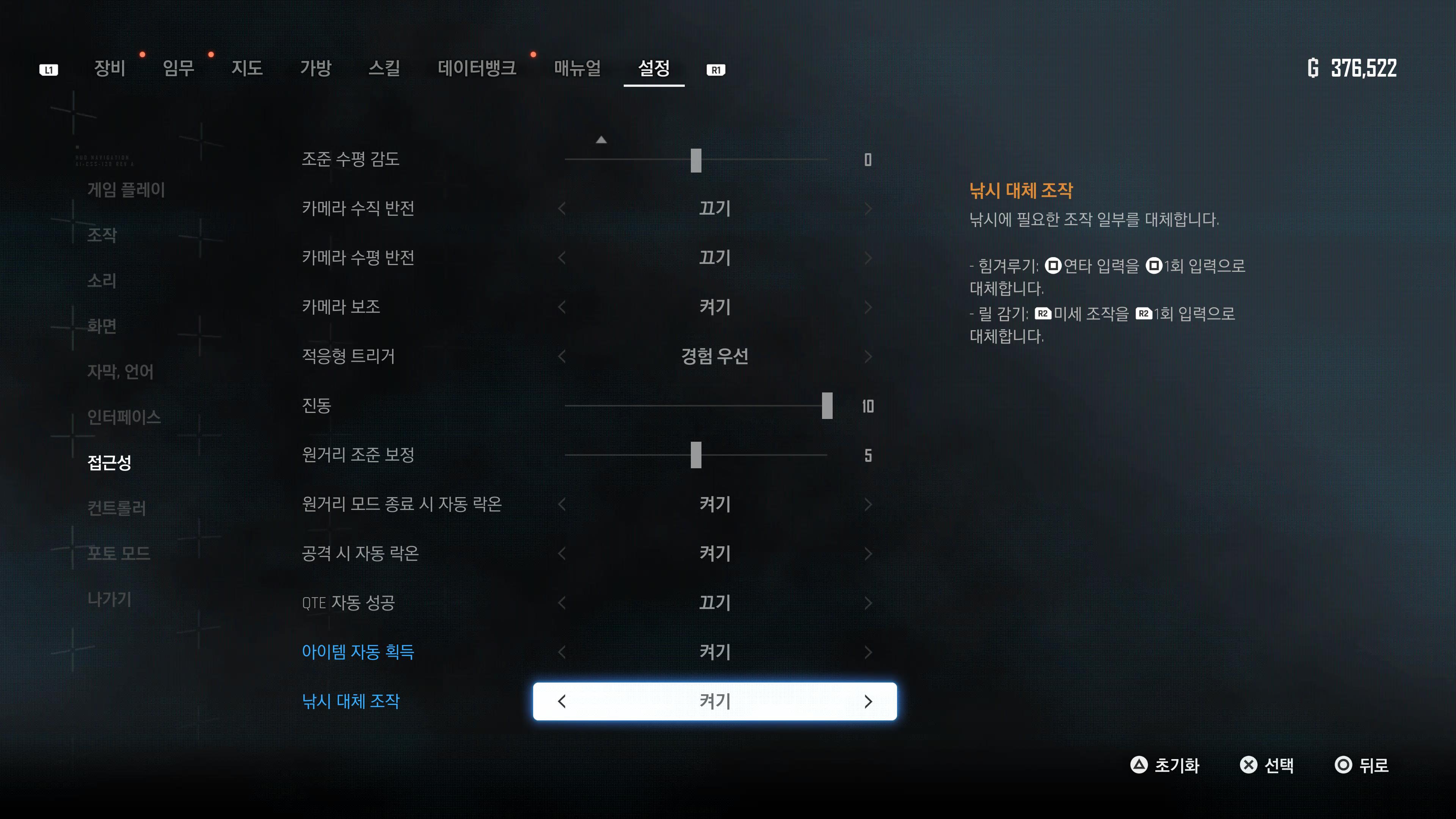 낚시는 설정 접근성 창으로 들어가 낚시 대체 조작 항목을 수정하면 쉽게 퀘스트시 진행이 가능하다.
