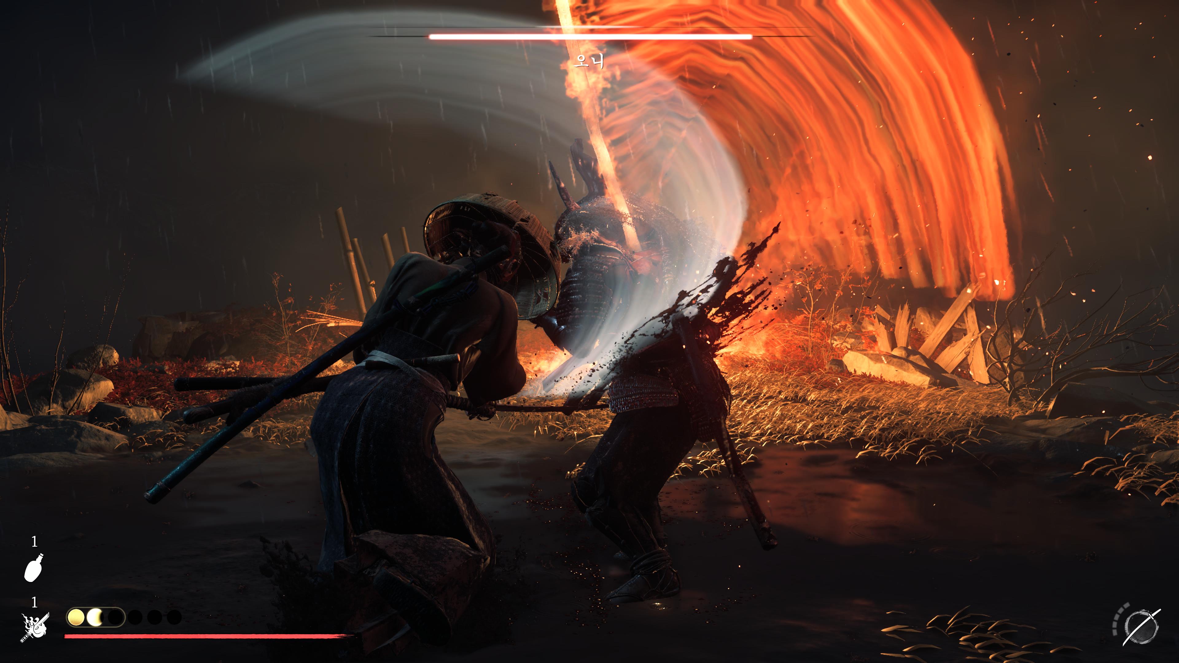 전투는 크게 근거리, 원거리, 암살 스킬들을 활용해 진행된다. 근거리의 경우 전작은 적패턴에 따른 4가지 자세를 바꿔가며 전투를 했다면 이번 작은 5가지 무기를 통해 바꿔가며 진행한다. 무기는 카타나, 이도류 카타나, 대태도, 사슬낫, 창 5가지이며 역시나 적패턴에 따라 무기를 바꿔가며 진행된다.