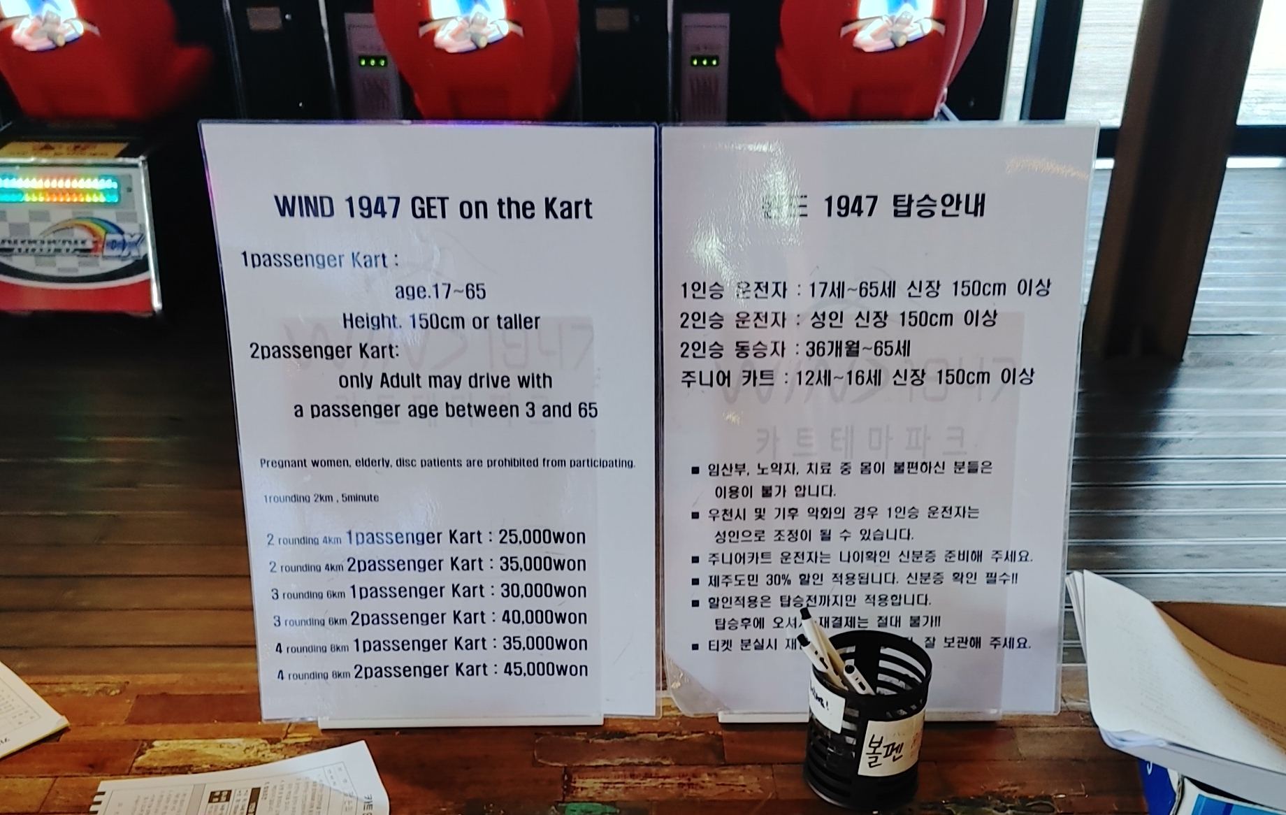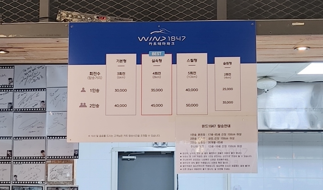내부로 들어가면 간략한 안내문이 보인다. 간단한 카트 안전수칙 및 종이 서약서 작성 후 티켓을 발권을 진행하면 된다. 카트는 1인승, 2인승, 주니어 카트가 있다. 카트별 탑승 제한사항이 있으니 맞게 선택하면 된다.