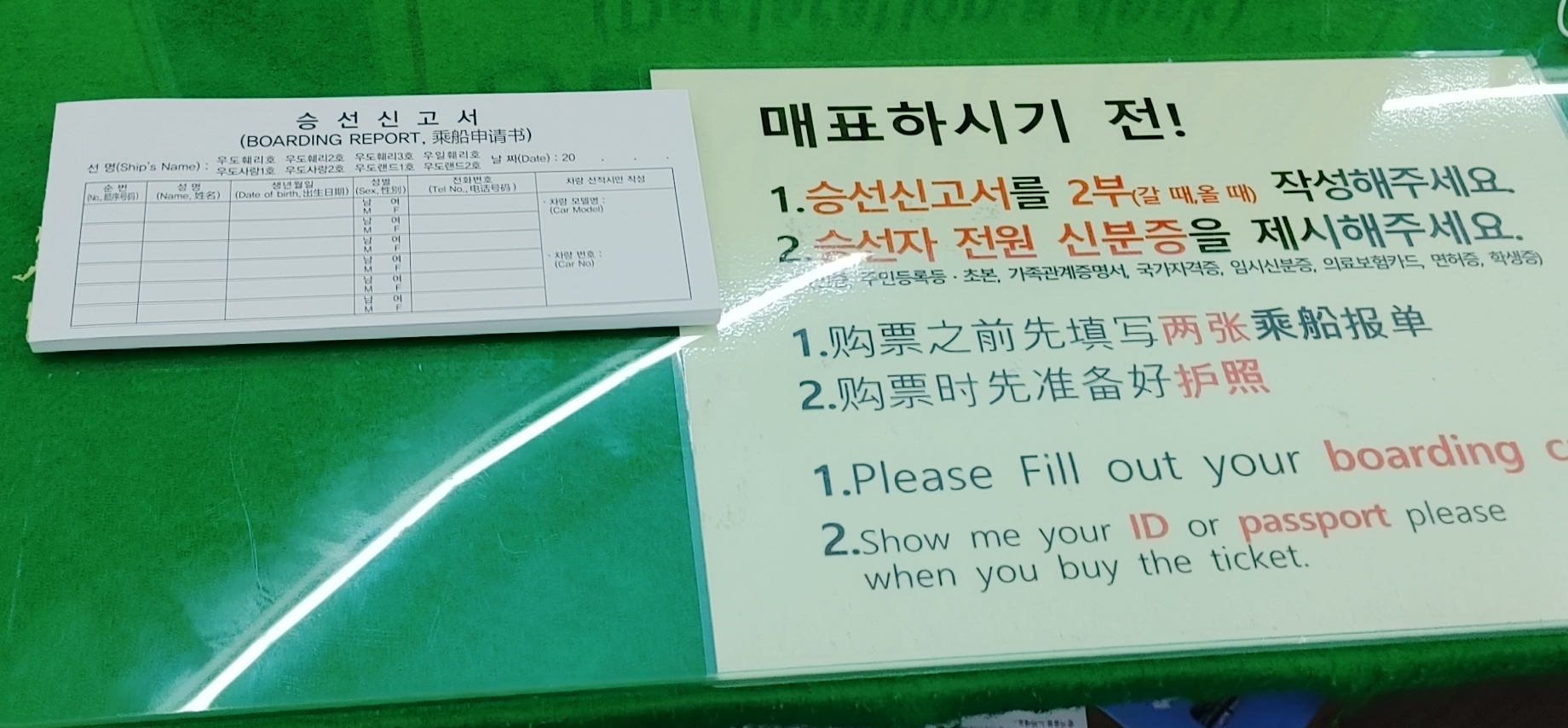 우도를 방문하기 위해 매표 전 승선 신고서 2부를 (왕복) 간단히 작성해야 한다. 승선자 전원 신분증이 필요하니 꼭 지참이 필요하다. 승선 신고서 작성 후 표를 발권하면 된다.