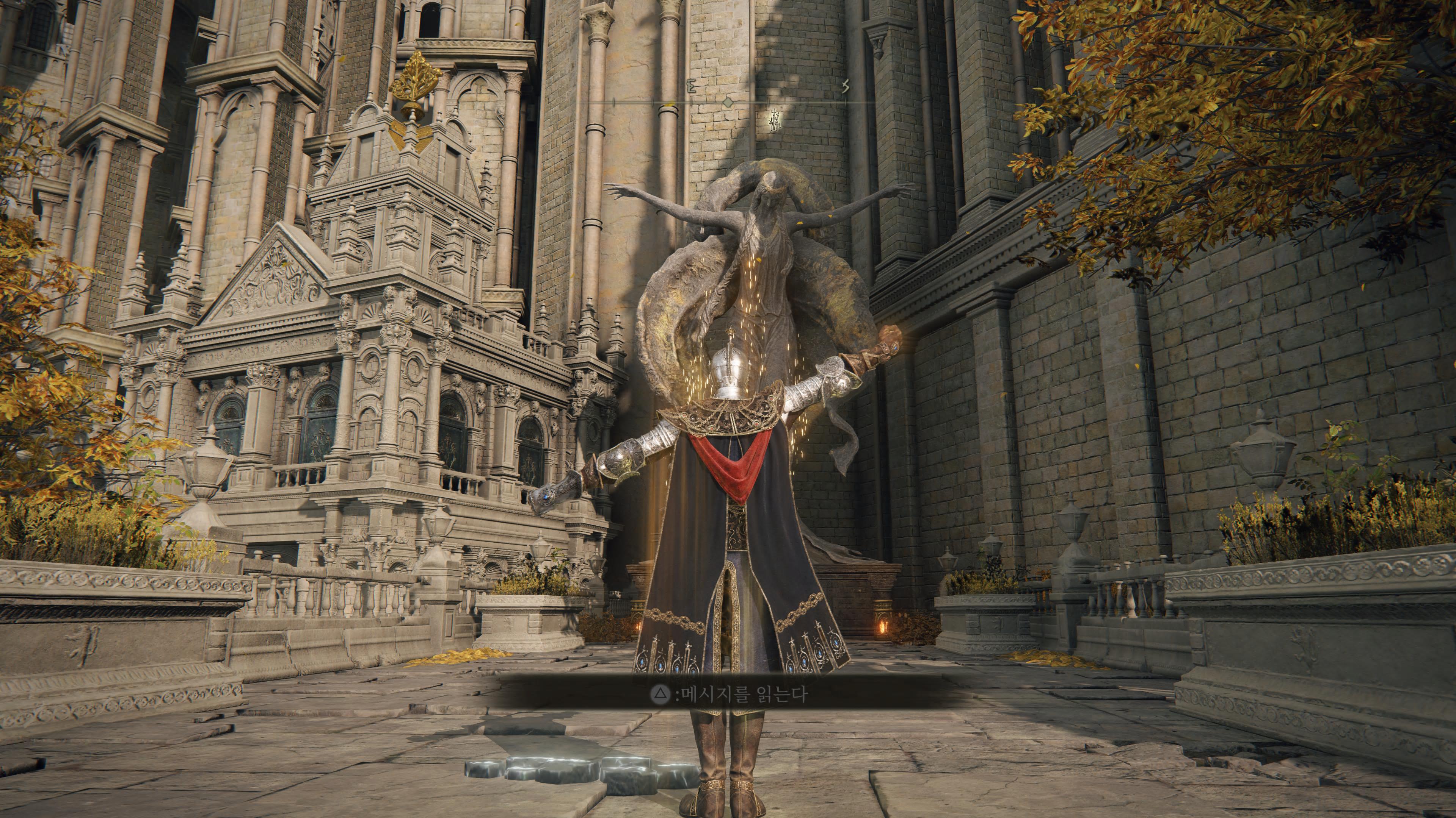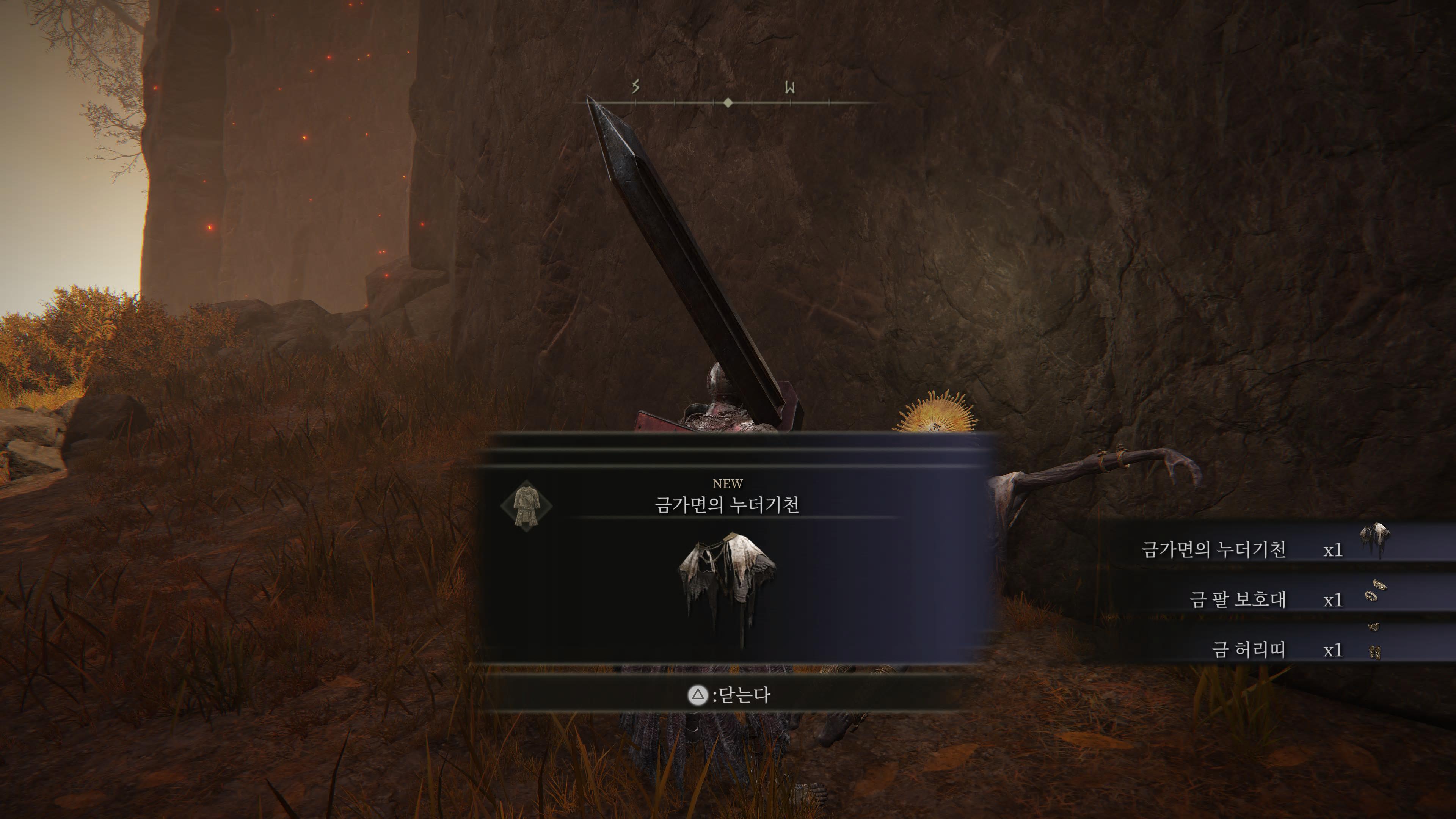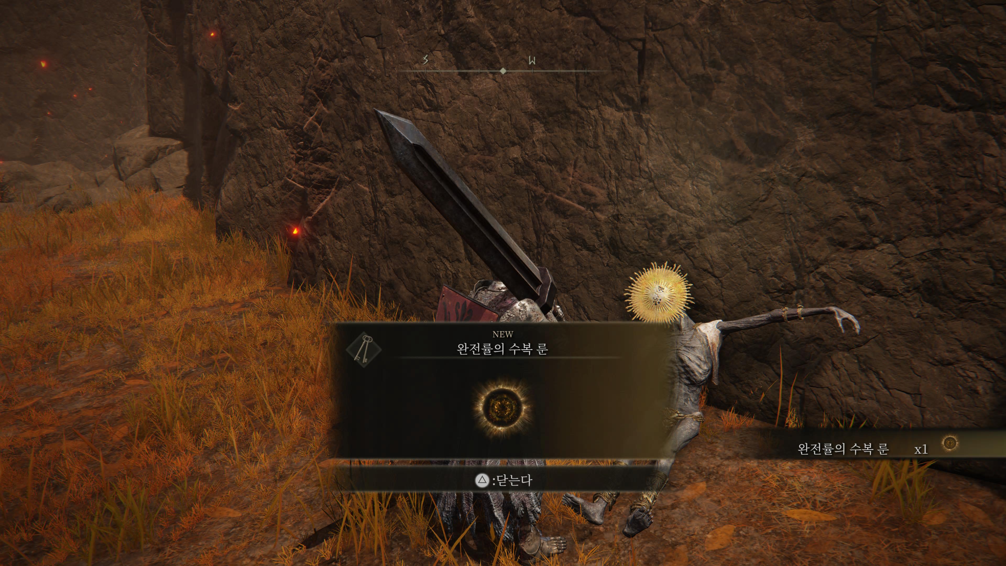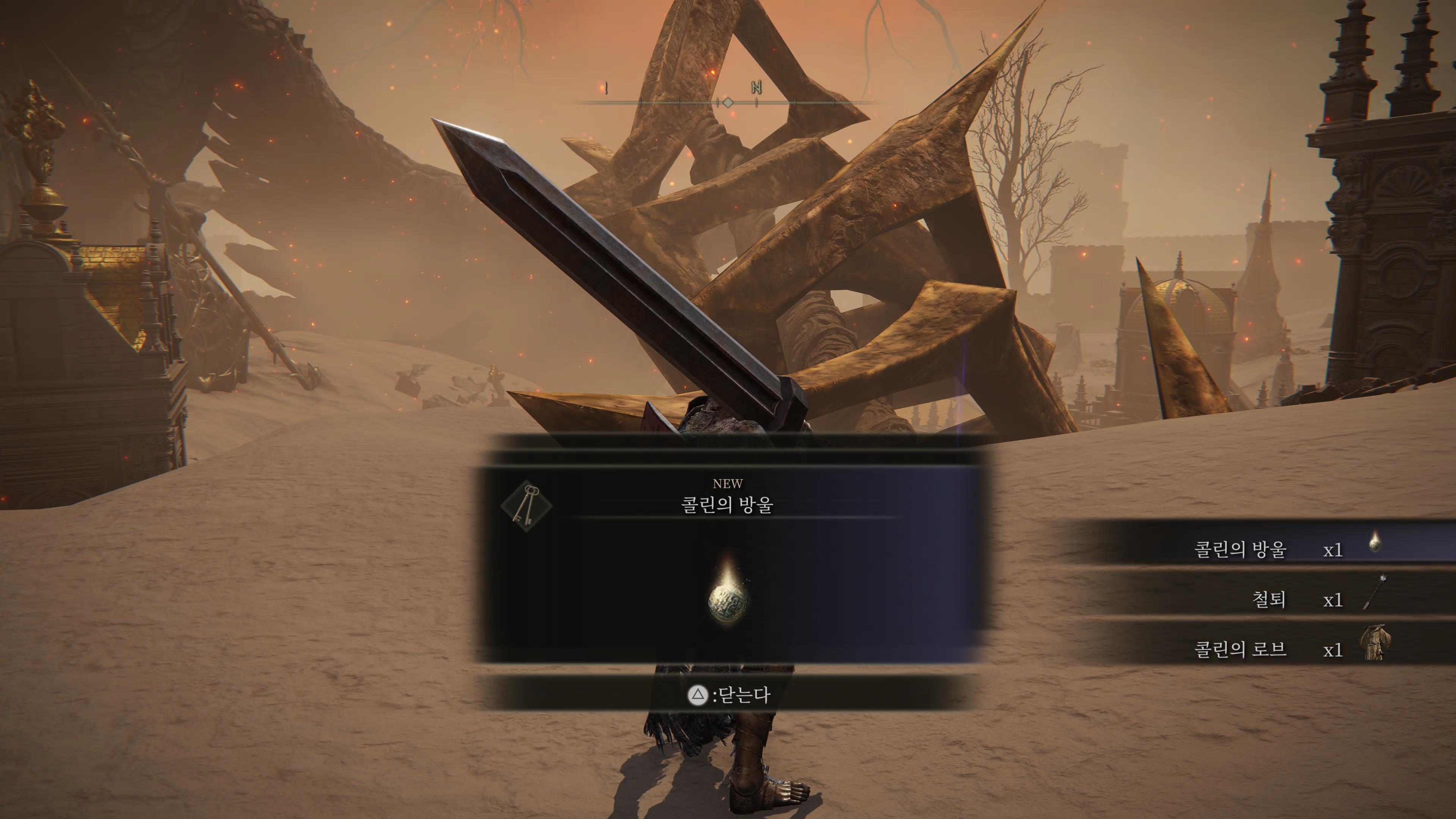 2. 진행순서 : 콜린 대화 → 금가면 경 시체 확인 (완전률의 수복 룬 획득) → 축복 휴식 or 종료 재접속 후 금가면 경, 콜린 아이템 획득